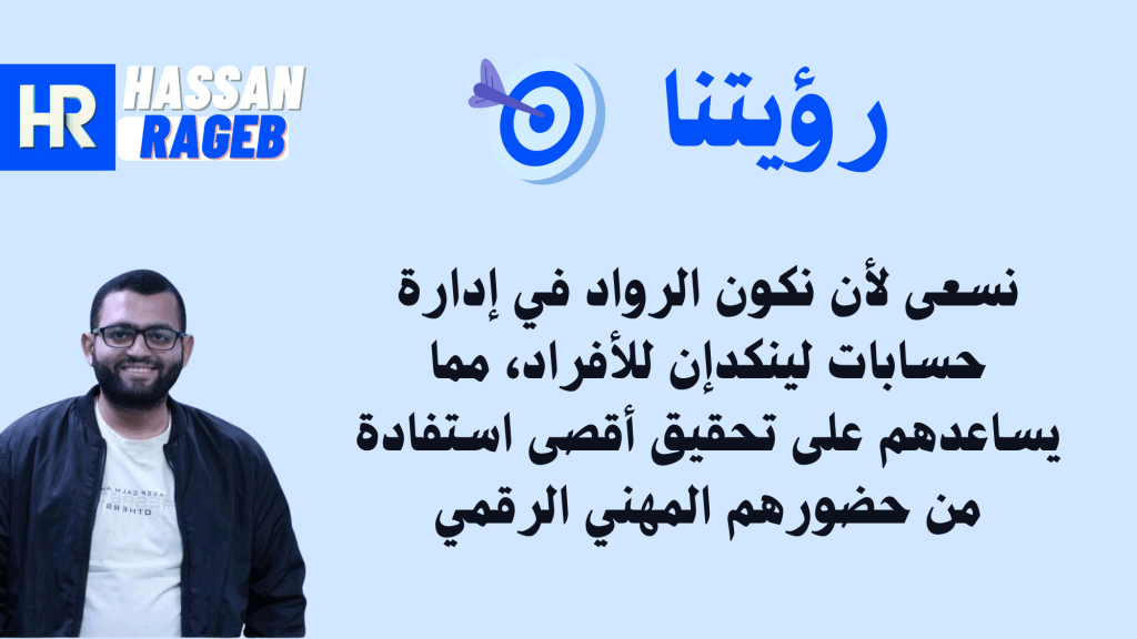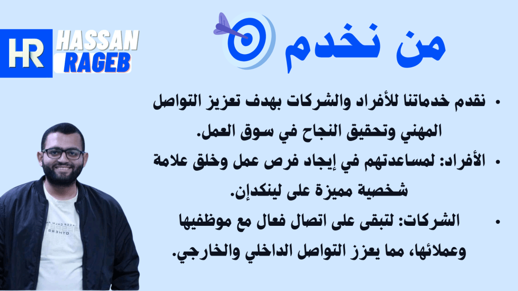 مرحبًا بكم في صفحتنا التي تسلط الضوء على رؤيتنا ورسالتنا وأهدافنا ومن نقدم خدماتنا لهم. نحن ملتزمون بتقديم أفضل الخدمات لتعزيز التواصل المهني وتحقيق النجاح في سوق العمل. تعرفوا على رؤيتنا المستقبلية، رسالتنا الملهمة، أهدافنا الطموحة، والفئات التي نخدمها لتحقيق هذا النجاح